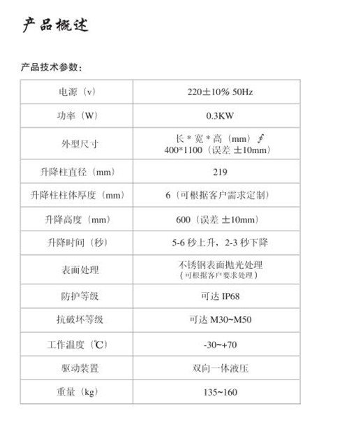 電動升降柱主要由電動升降柱體、氣缸、導向軸、封蓋、外箱、鎖等部分組成。升降體:采用304國標不銹鋼8mm/6mm厚鋼管加工形成,具有高強度的承重和抗撞能力;柱體內無電器、線路設置,防水、安全。